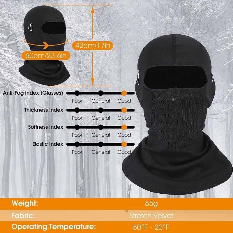 (1)Balaclava Ski Mask: Provides great protection to your face, ear and neck from sun.Extremely elastic strong and durable – wrinkle free – lightweight, portable and comfortable,ventilation – quick drying.